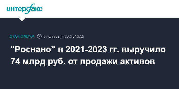Москва. 21 февраля. INTERFAX.RU - "Роснано" в 2021-2023 годах реализовало активы из исторического портфеля на сумму более 74 млрд рублей, сообщил "Интерфаксу" управляющий финансовый директор Владислав Юнусов.