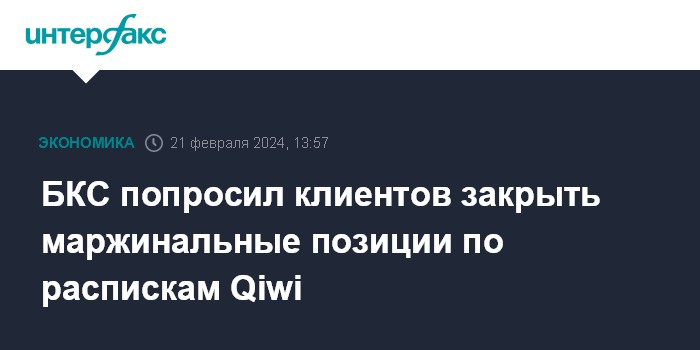 Москва. 21 февраля. INTERFAX.RU - Клиенты БКС должны до 16:00 по Москве закрыть все "шорты" по распискам Qiwi и обеспечить деньгами свои лонговые позиции, сообщил телеграм-канал брокера.