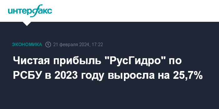 Москва. 21 февраля. INTERFAX.RU - Чистая прибыль ПАО "РусГидро" по РСБУ в 2023 году выросла на 25,7% по сравнению с 2022 годом, до 32,67 млрд рублей, говорится в отчете компании.