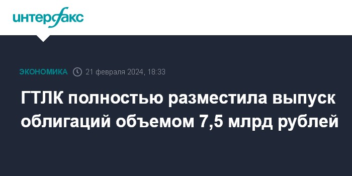 Москва. 21 февраля. INTERFAX.RU - АО "Государственная транспортная лизинговая компания" (ГТЛК) полностью разместило выпуск 15-летних облигаций с офертой через 3,25 года серии 002P-03 объемом 7,5 млрд рублей, сообщил эмитент.