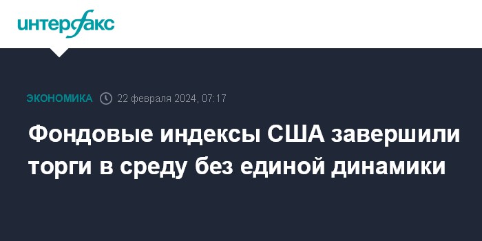 Москва. 22 февраля. INTERFAX.RU - Американские фондовые индексы завершили торги в среду без единой динамики: Dow Jones и S&P 500 прибавили по 0,1%, в то время как Nasdaq опустился по итогам третьей сессии подряд (на 0,3%).