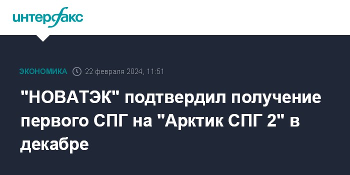 Москва. 22 февраля. INTERFAX.RU - "НОВАТЭК" подтвердил получение в декабре первого сжиженного природного газа (СПГ) на заводе "Арктик СПГ 2".