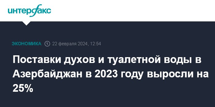 Москва. 21 февраля. INTERFAX.RU - Импорт духов и туалетной воды в Азербайджан в 2023 году по сравнению с 2022 годом увеличился на 25,4% в количественном выражении и на 18,2% в денежном выражении, сообщили "Интерфаксу" в Госкомстате.