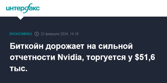 Москва. 22 февраля. INTERFAX.RU - Биткойн умеренно дорожает в четверг после того, как сильная отчетность Nvidia Corp. улучшила настроение инвесторов по отношению к рисковым активам.