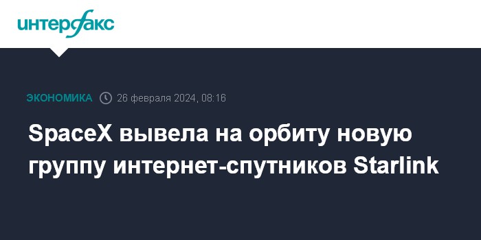 Москва. 26 февраля. INTERFAX.RU - Ракета-носитель Falcon 9 в понедельник по московскому времени успешно вывела на орбиту очередную партию из 24 мини-спутников для пополнения орбитальной группировки глобальной сети интернет-покрытия системы Starlink, сообщила компания-разработчик SpaceX.