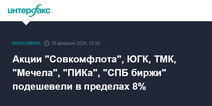 Акции "Совкомфлота", ЮГК, ТМК, "Мечела", "ПИКа", "СПБ биржи" подешевели в пределах 8%