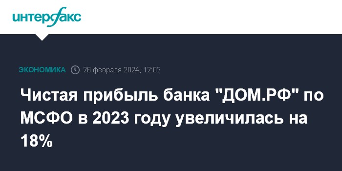 Москва. 26 февраля. INTERFAX.RU - Чистая прибыль банка "ДОМ.РФ" по МСФО по итогам 2023 года увеличилась на 18%, до 29,3 млрд рублей, говорится в сообщении кредитной организации.