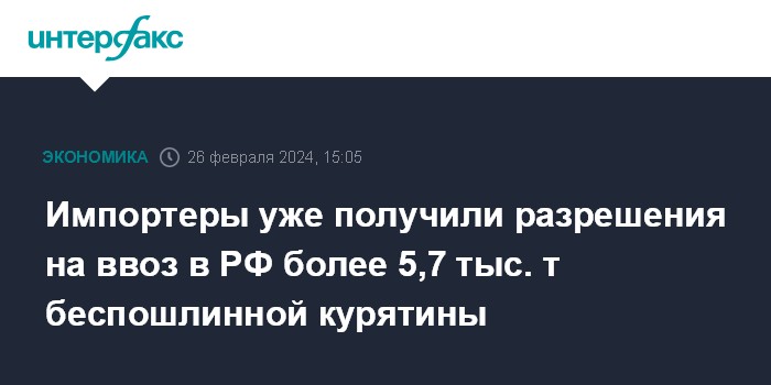 Москва. 26 февраля. INTERFAX.RU - Минсельхоз одобрил ввоз в РФ 5 тыс. 714 тонн мяса кур в рамках беспошлинной квоты (коды 0207 14 100 9 и 0207 14 500 9 ТН ВЭД ЕАЭС).