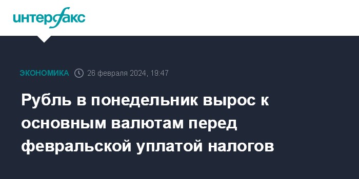 Как отмечают эксперты "Интерфакс-ЦЭА", рубль умеренно подрос к основным валютам днем по итогам торгов в понедельник в рамках подготовки компаний-экспортеров к единому дню уплаты налогов в среду, 28 февраля. В этот день им предстоит перечислить в бюджет единый налоговый платеж, который, в том числе, включает акцизы, НДС, НДПИ, налог на прибыль.