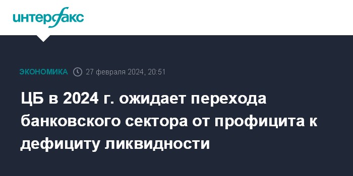 Москва. 27 февраля. INTERFAX.RU - ЦБ РФ во второй половине 2024 года ожидает переход банковского сектора от профицита к дефициту ликвидности, на конец года он может составить от 0,6 до 1,4 трлн руб., говорится в комментарии регулятора к среднесрочному макропрогнозу.