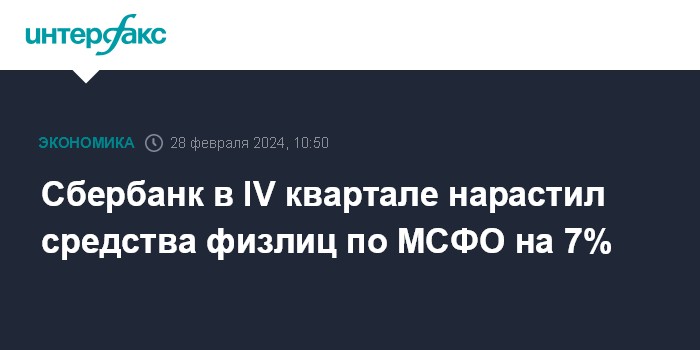 Сбербанк в IV квартале нарастил средства физлиц по МСФО на 7%