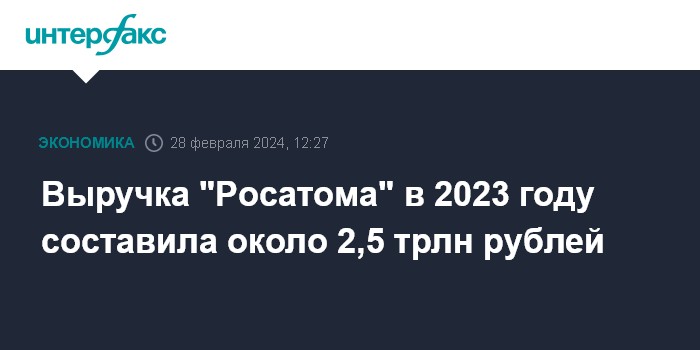 Москва. 28 февраля. INTERFAX.RU - Выручка ГК "Росатом" в 2023 г. составила около 2,5 трлн руб., сообщил гендиректор компании Алексей Лихачев в ходе выступления в Госдуме.
