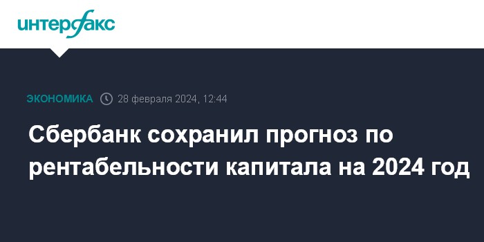 Москва. 28 февраля. INTERFAX.RU - Сбербанк сохранил прогноз рентабельности капитала на 2024 год на уровне свыше 22%, говорится в презентации банка.