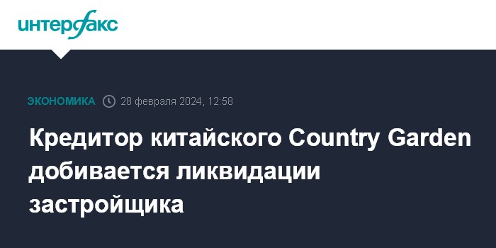 Москва. 28 февраля. INTERFAX.RU - Компания Ever Credit Limited подала в суд Гонконга ходатайство о ликвидации проблемного китайского застройщика Country Garden.