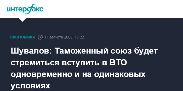 Москва. 11 августа. INTERFAX.RU - Таможенный союз будет стремиться присоединиться к ВТО одновременно и на одинаковых условиях, но часть вопросов из-за юридических сложностей может решаться в двустороннем формате при предварительном согласовании между партнерами Таможенного союза, заявил журналистам во вторник первый вице-премьер РФ Игорь Шувалов, комментируя повестку заседания комиссии Таможенного союза, которая пройдет в среду в Москве.