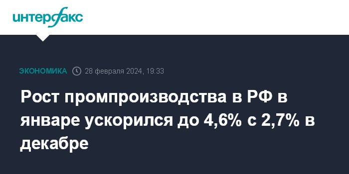 Данные по промышленности в январе 2024 года оказались лучше ожиданий экономистов. Консенсус-прогноз аналитиков, опрошенных "Интерфаксом" в начале февраля, предусматривал рост промпроизводства РФ за январь на 4,0%.