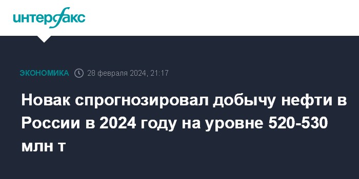 Москва. 28 февраля. INTERFAX.RU - Добыча нефти в России сейчас составляет около 9,5 млн баррелей в сутки, обязательства и добровольные ограничения в рамках ОПЕК+ выполняются, сообщил журналистам вице-премьер Александр Новак. "По итогам года, мне кажется, (добыча - ИФ) будет в диапазоне 520-530 млн т", - спрогнозировал он.