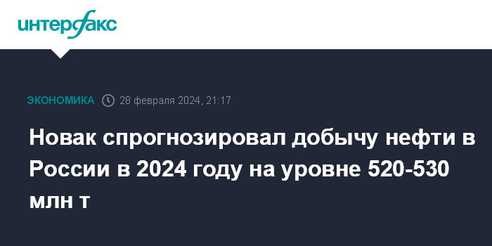 Новак спрогнозировал добычу нефти в России в 2024 году на уровне 520-530 млн т