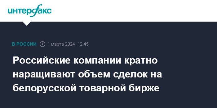 Москва. 1 марта. INTERFAX.RU - Объем сделок российских компаний на Белорусской универсальной товарной бирже (БУТБ) в январе-феврале 2024 года превысил в эквиваленте $130 млн , увеличившись в 6,6 раза по сравнению с показателем аналогичного периода прошлого года, сообщила пресс-служба БУТБ.