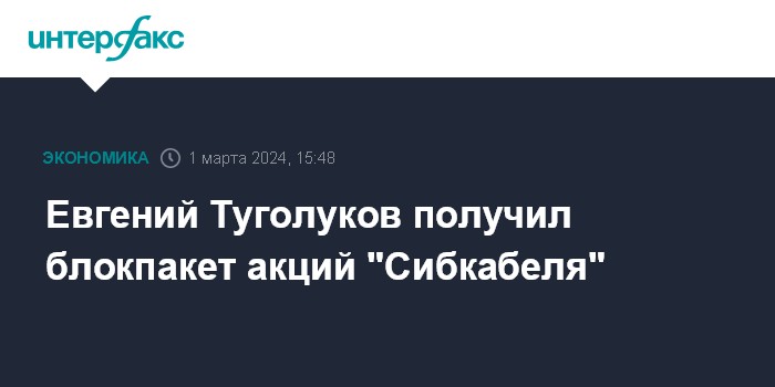 Москва. 1 марта. INTERFAX.RU - Владельцем блокирующего пакета акций АО "Сибкабель" (Томск, входит в холдинг "Кабельный альянс", ХКА) стал Евгений Туголуков, говорится в сообщении компании.