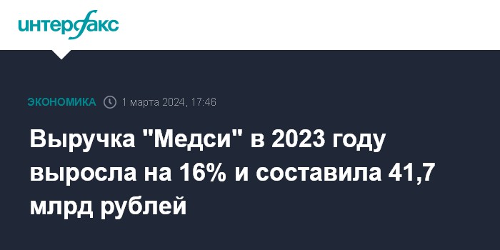 Москва. 1 марта. INTERFAX.RU - Выручка АО "Группа компаний "Медси" в 2023 году выросла на 16% и достигла 41,7 млрд рублей, говорится в консолидированном отчете компании.