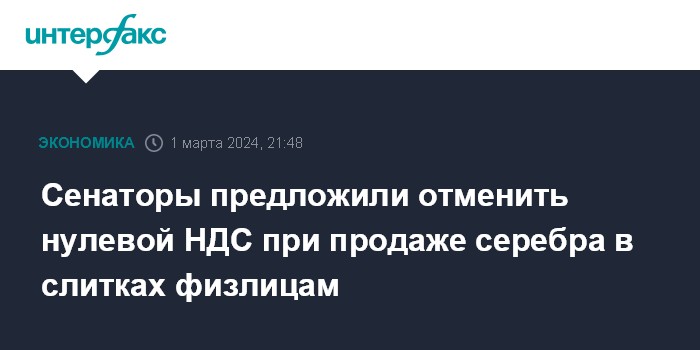Москва. 1 марта. INTERFAX.RU - Группа сенаторов внесла в Госдуму законопроект, который отменяет нулевой НДС на продажу банками, аффинажными организациями, "Гознаком" серебра в слитках физическим лицам. Также отменяется введенная с 1 октября 2023 г. льгота по НДС в случае, если продажу серебра в слитках гражданам проводит компания, его добывающая.