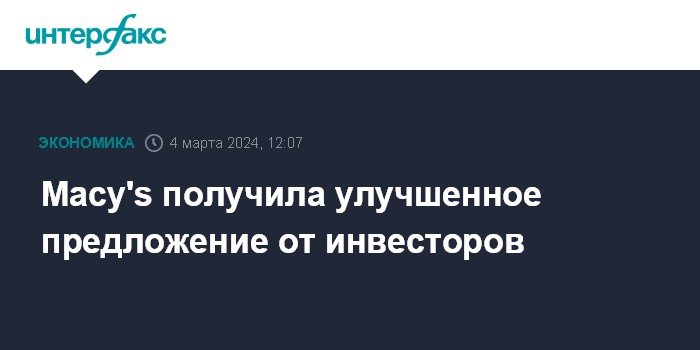 Москва. 4 марта. INTERFAX.RU - Американская сеть универмагов Macy's Inc. в воскресенье получила улучшенное предложение от инвесткомпаний Arkhouse Management и Brigade Capital Management.