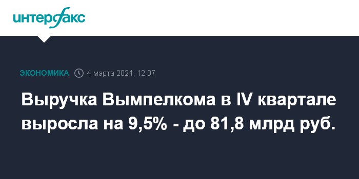 Москва. 4 марта. INTERFAX.RU - Выручка ПАО "Вымпелком" в IV квартале увеличилась на 9,5% - до 81,8 млрд рублей, говорится в сообщении компании.