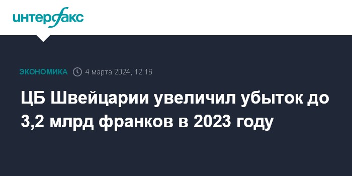 ЦБ Швейцарии увеличил убыток до 3,2 млрд франков в 2023 году