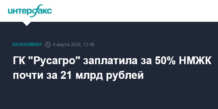 ГК "Русагро" заплатила за 50% НМЖК почти за 21 млрд рублей