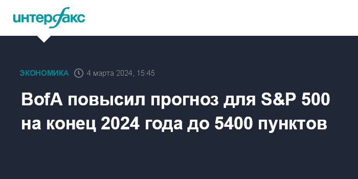 Москва. 4 марта. INTERFAX.RU - Аналитик Bank of America Савита Субраманиан улучшила прогноз для американского фондового индекса S&P 500 на конец 2024 года до 5400 пунктов с ранее ожидавшихся 5000 пунктов.