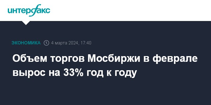 Объем торгов Мосбиржи в феврале вырос на 33% год к году