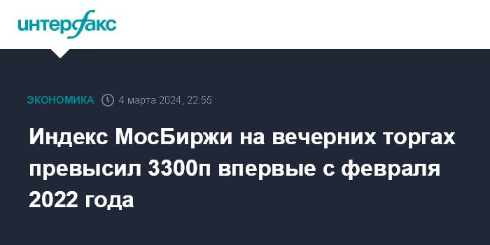 Москва. 4 марта. INTERFAX.RU - Индекс МосБиржи (IMOEX2), рассчитываемый за весь торговый день, включая дополнительные сессии, на вечерних торгах в понедельник превысил психологический рубеж 3300 пунктов впервые с февраля 2022 года, несмотря на нисходящую коррекцию нефти (Brent просела к $82,6 за баррель) и фондовых площадок в США.