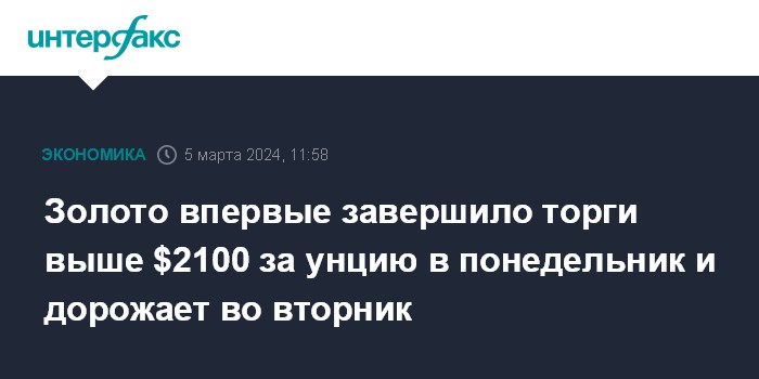 Золото впервые завершило торги выше $2100 за унцию в понедельник и дорожает во вторник