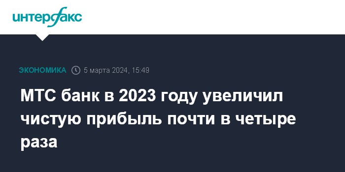 Москва. 5 марта. INTERFAX.RU - МТС банк в 2023 году увеличил чистую прибыль в 3,8 раза, до 12,5 млрд рублей, следует из отчетности по МСФО его акционера - компании "МТС".