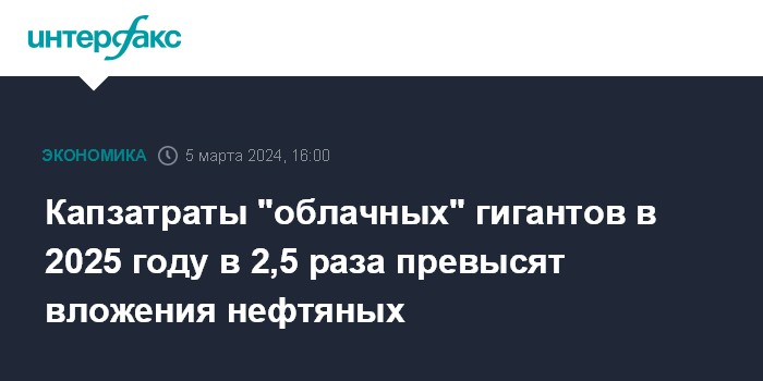 Москва. 5 марта. INTERFAX.RU - Общие капитальные затраты четырех крупнейших компаний сферы "облачной" инфраструктуры в 2025 году почти в 2,5 раза превысят затраты четырех крупнейших нефтяных компаний, сказано в прогнозе Wells Fargo Investment Institute.