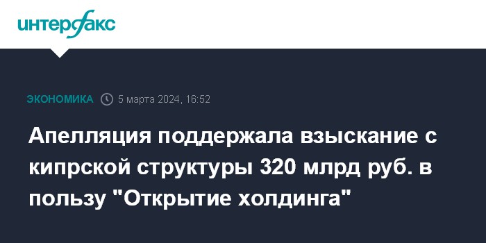 Апелляция поддержала взыскание с кипрской структуры 320 млрд руб. в пользу "Открытие холдинга"