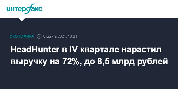 Москва. 6 марта. INTERFAX.RU - Выручка HeadHunter в IV квартале 2023 года увеличилась на 72% год к году - до 8,49 млрд рублей, сообщила компания.