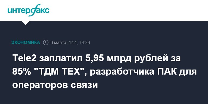Tele2 заплатил 5,95 млрд рублей за 85% "ТДМ ТЕХ", разработчика ПАК для операторов связи