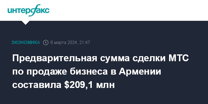 Москва. 6 марта. INTERFAX.RU - Сумма сделки ПАО "МТС" по продаже бизнеса в Армении составила $209,1 млн, следует из годового отчета компании.
