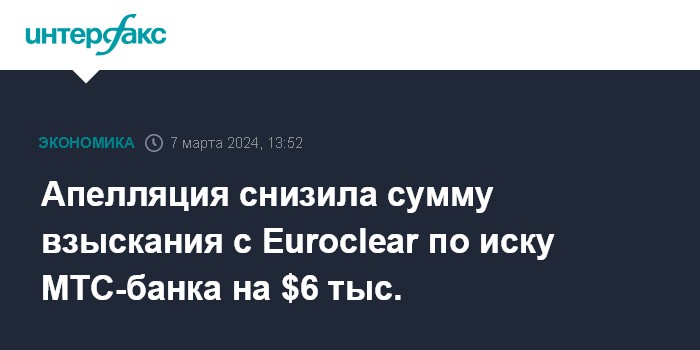 Апелляция снизила сумму взыскания с Euroclear по иску МТС-банка на $6 тыс.