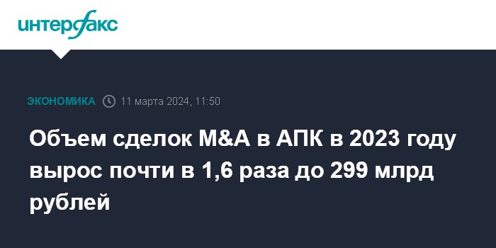 Москва. 11 марта. INTERFAX.RU - Объем сделок M&A в АПК РФ составил 299 млрд рублей, что на 56% больше, чем в 2022 году (192 млрд рублей). Об этом сообщил управляющий директор департамента крупного бизнеса Россельхозбанка Илья Шумов на онлайн-конференции в понедельник.