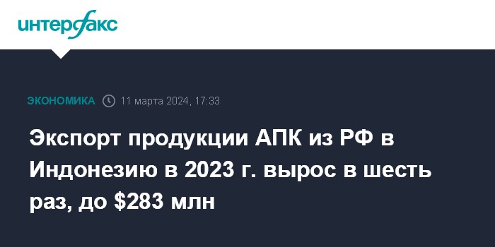 Экспорт продукции АПК из РФ в Индонезию в 2023 г. вырос в шесть раз, до $283 млн
