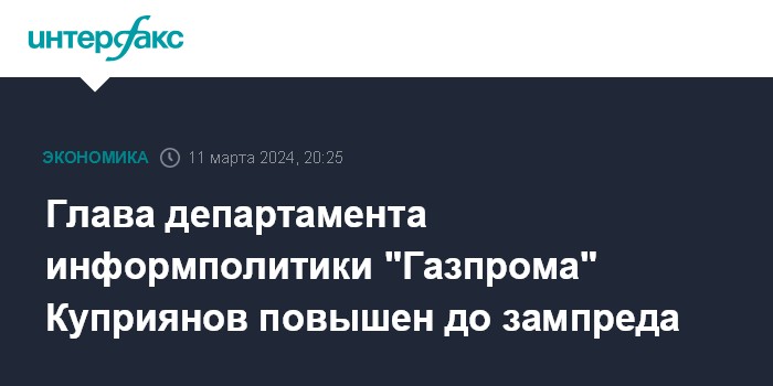 Москва. 11 марта. INTERFAX.RU - Начальник департамента информационной политики (106) "Газпрома" Сергей Куприянов повышен до зампреда.