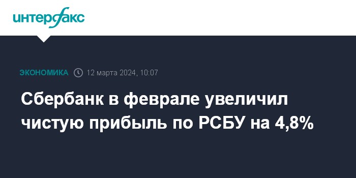 Москва. 12 марта. INTERFAX.RU - Сбербанк в январе-феврале 2024 года увеличил чистую прибыль по РСБУ на 4,7% - до 235,5 млрд рублей по сравнению с 225 млрд рублей прибыли годом ранее, говорится в сообщении банка.