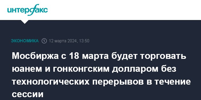 Москва. 12 марта. INTERFAX.RU - Московская биржа с 18 марта будет проводить торги китайским юанем и гонконгским долларом без технологических перерывов в течение сессии, сообщается в пресс-релизе на сайте торговой площадки.
