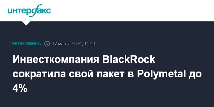 Москва. 12 марта. INTERFAX.RU - Инвесткомпания BlackRock, второй крупнейший акционер Polymetal, сократила свой пакет на 3,43 п.п., до чуть более 4%.