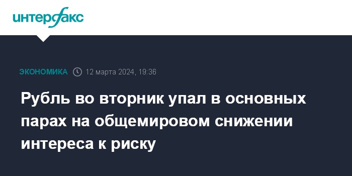 Как отмечают эксперты "Интерфакс-ЦЭА", рубль упал в основных валютных парах по итогам торгов во вторник на фоне общемирового снижения аппетита инвесторов к риску после публикации данных об инфляции в США, которые оказались хуже прогнозов. Одновременно участники внутреннего валютного рынка переходят в режим ожидания результатов президентских выборов в России, которые пройдут в течение трех дней - с 15 по 17 марта.