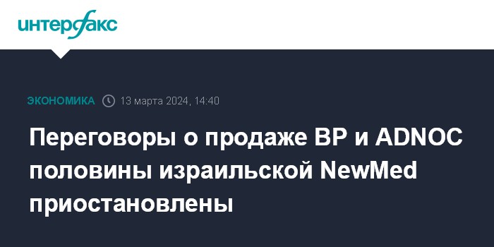 Москва. 13 марта. INTERFAX.RU - Израильская газовая NewMed приостановила переговоры с BP plc и Abu Dhabi National Oil Co. (ADNOC) о продаже им доли в 50%, говорится в сообщении NewMed.