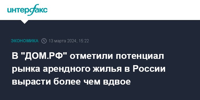 Москва. 13 марта. INTERFAX.RU - Рынок арендного жилья в России способен вырасти более чем в два раза, сообщила на онлайн-конференции заместитель руководителя развития бизнеса и инвестиций в подразделении "Арендное жилье" института развития Светлана Гаева.